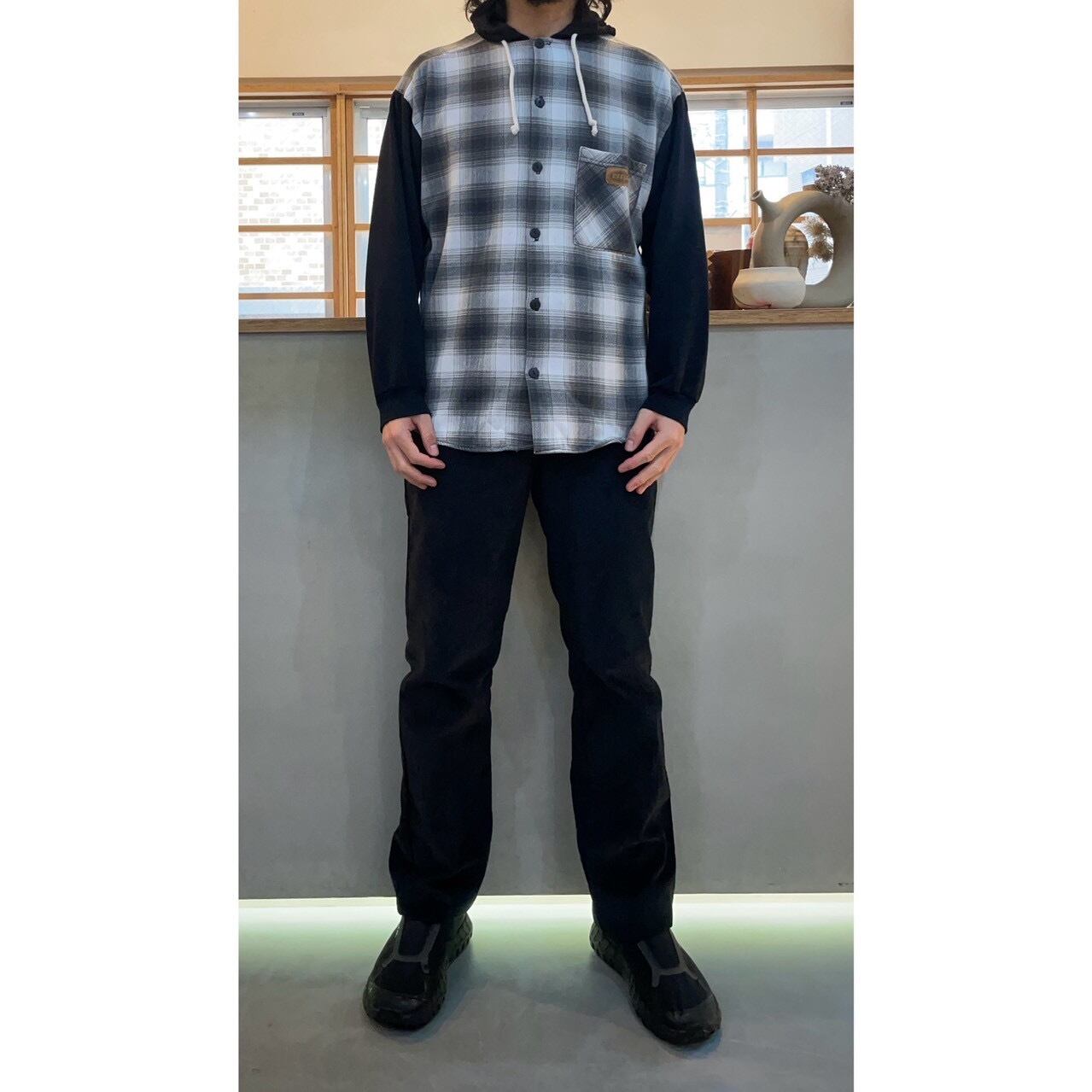スウェット素材でフーデットシャツ型