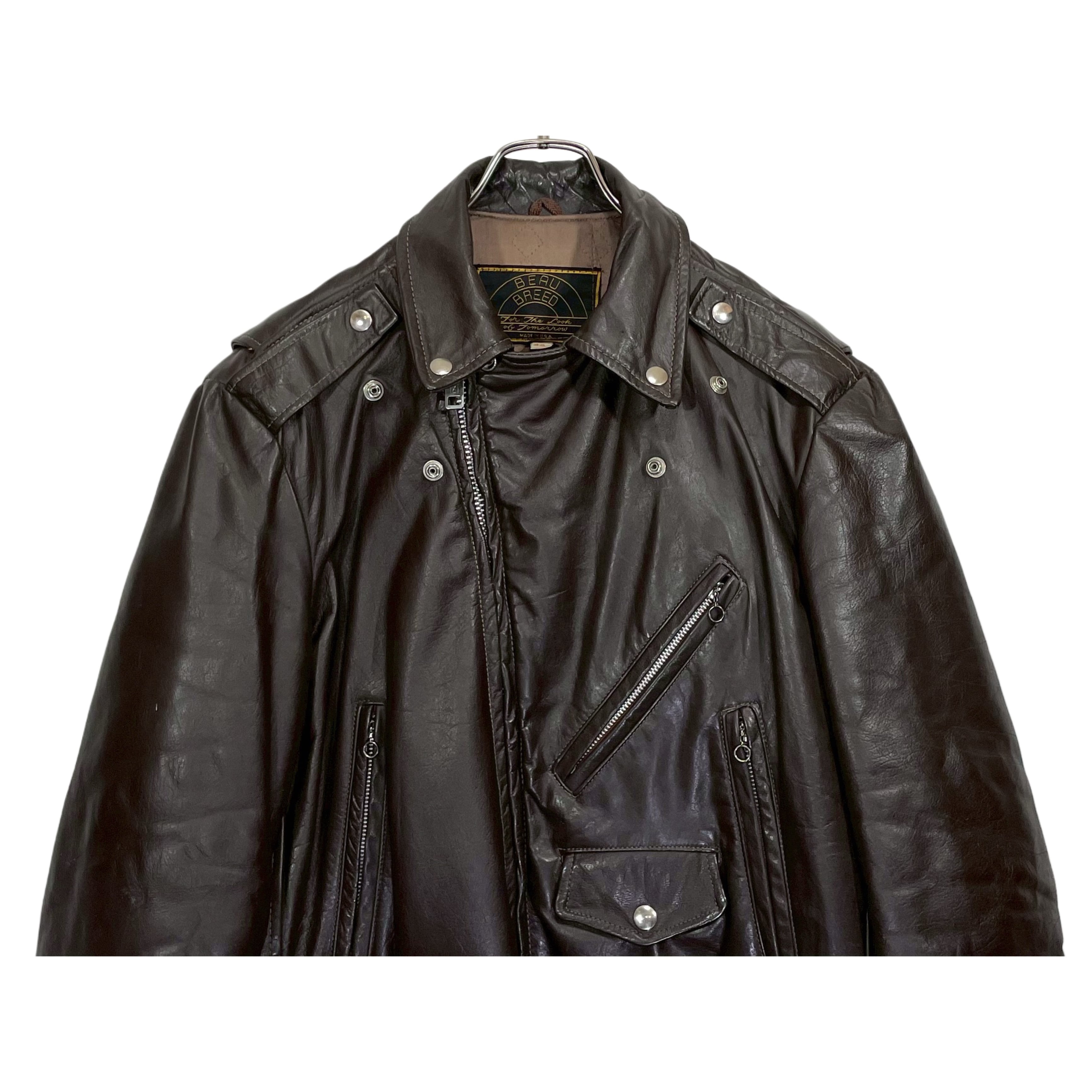 -70s BEAU BREED brown leather zip up double riders jacket
