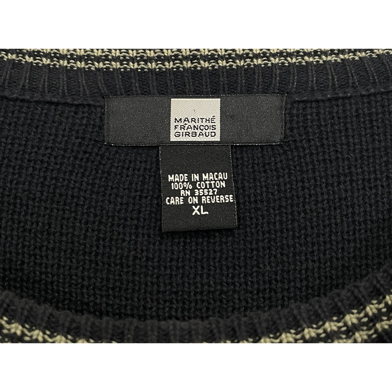 -00s Marithé François Girbaud navy/olive/red cotton jaquard knit oversized crew neck cotton knit sweater