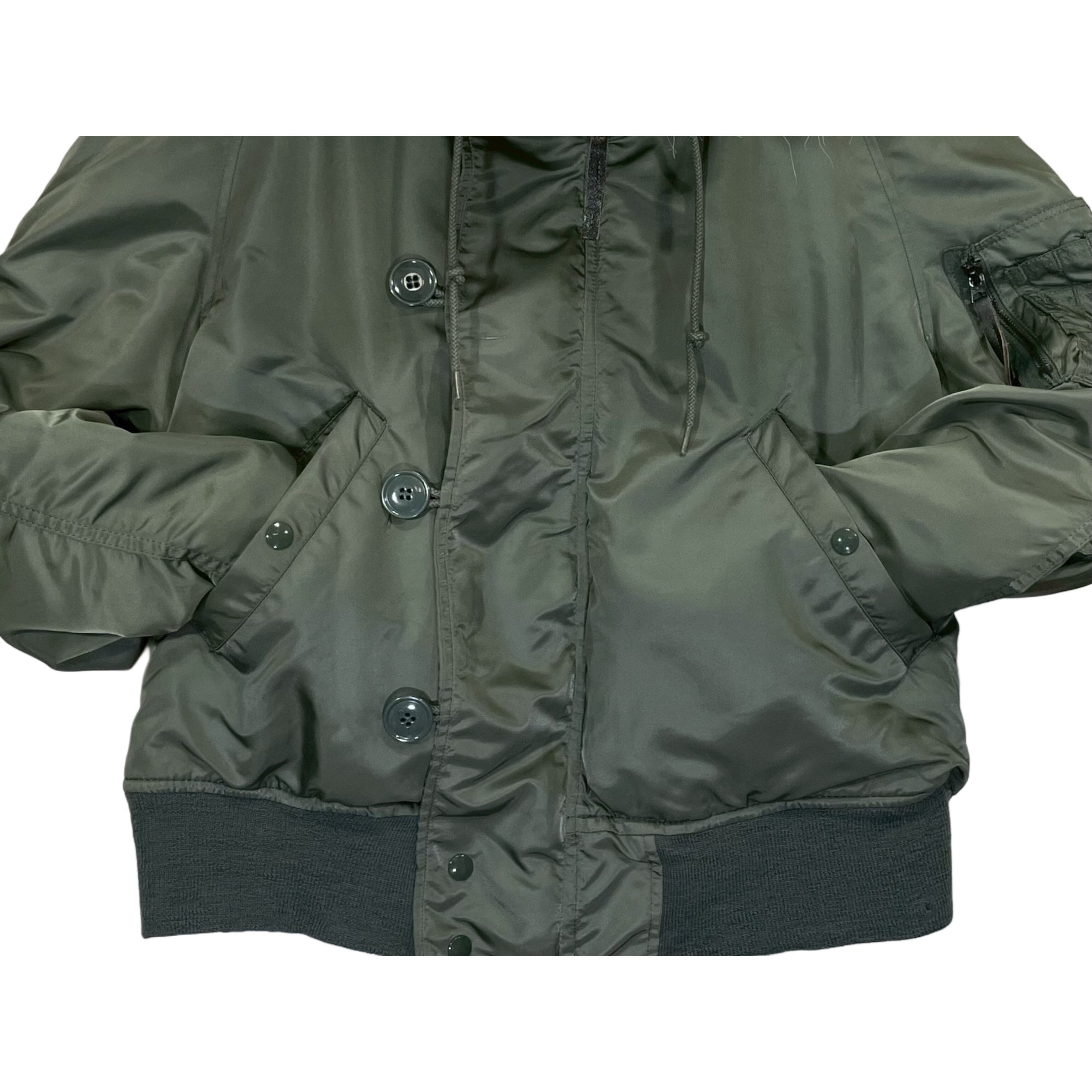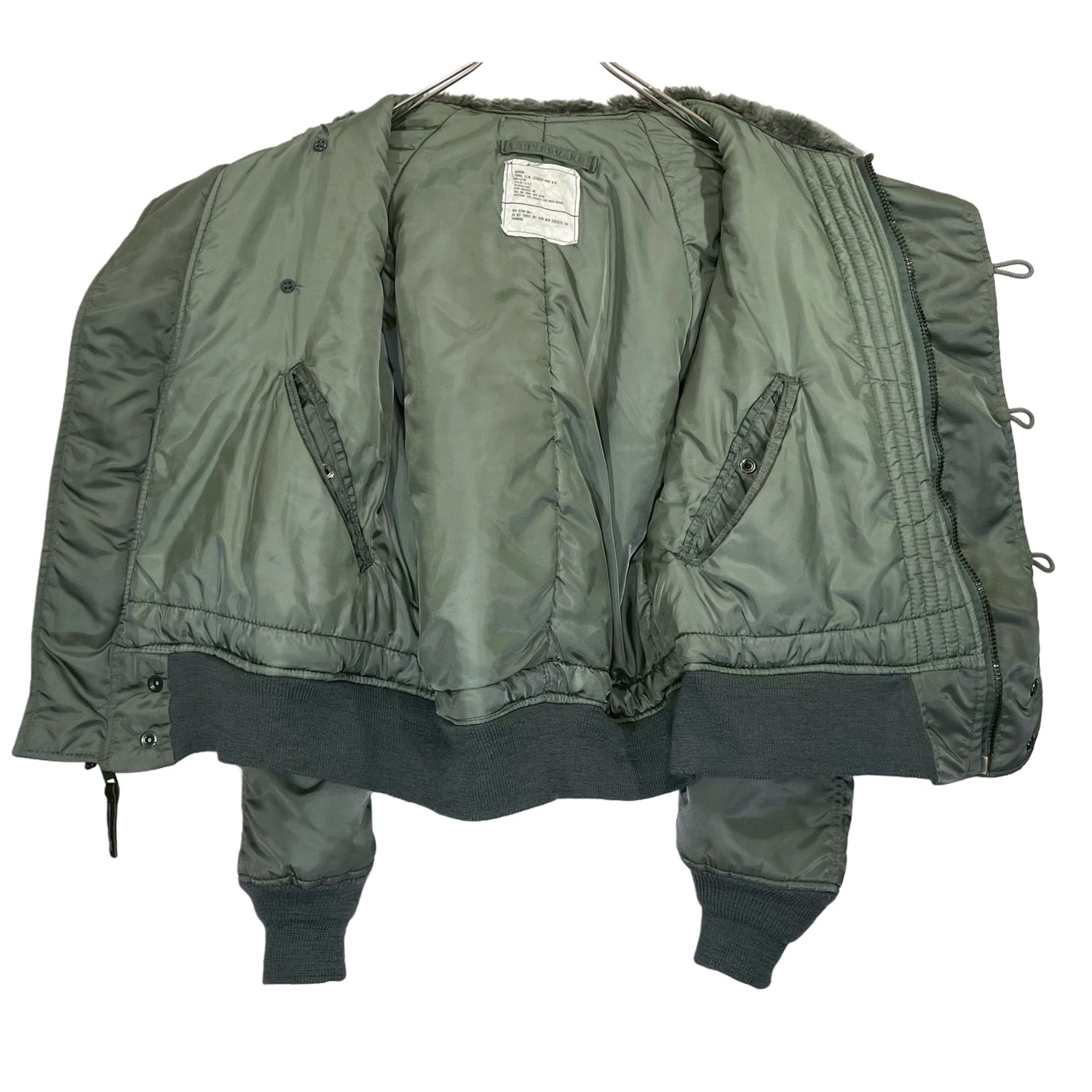 80s USAF "PARKA, E.C.W., ATTACHED HOOD N-2B" olive nylon thintetic fiber quilted lining short length zip up hooded flight jacke