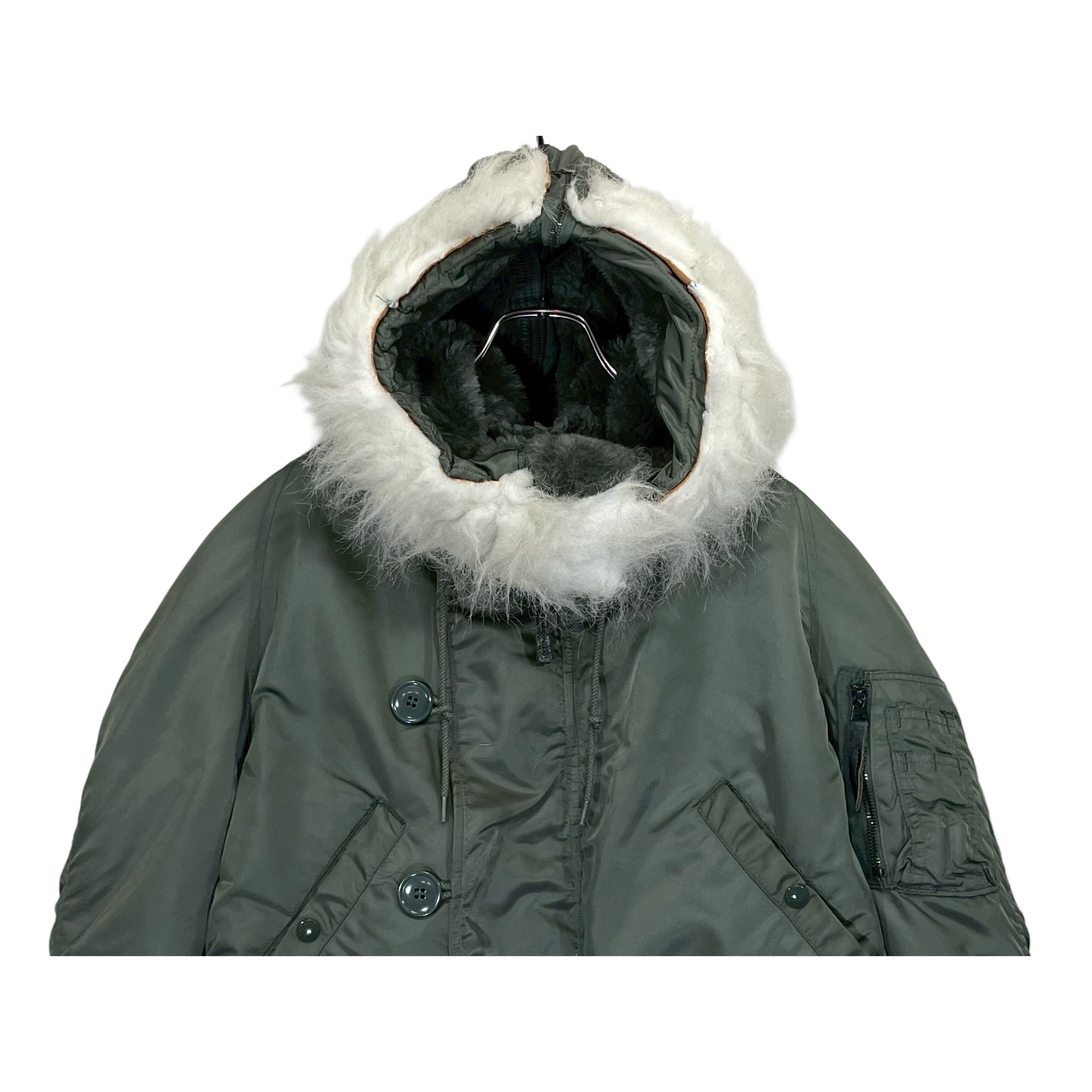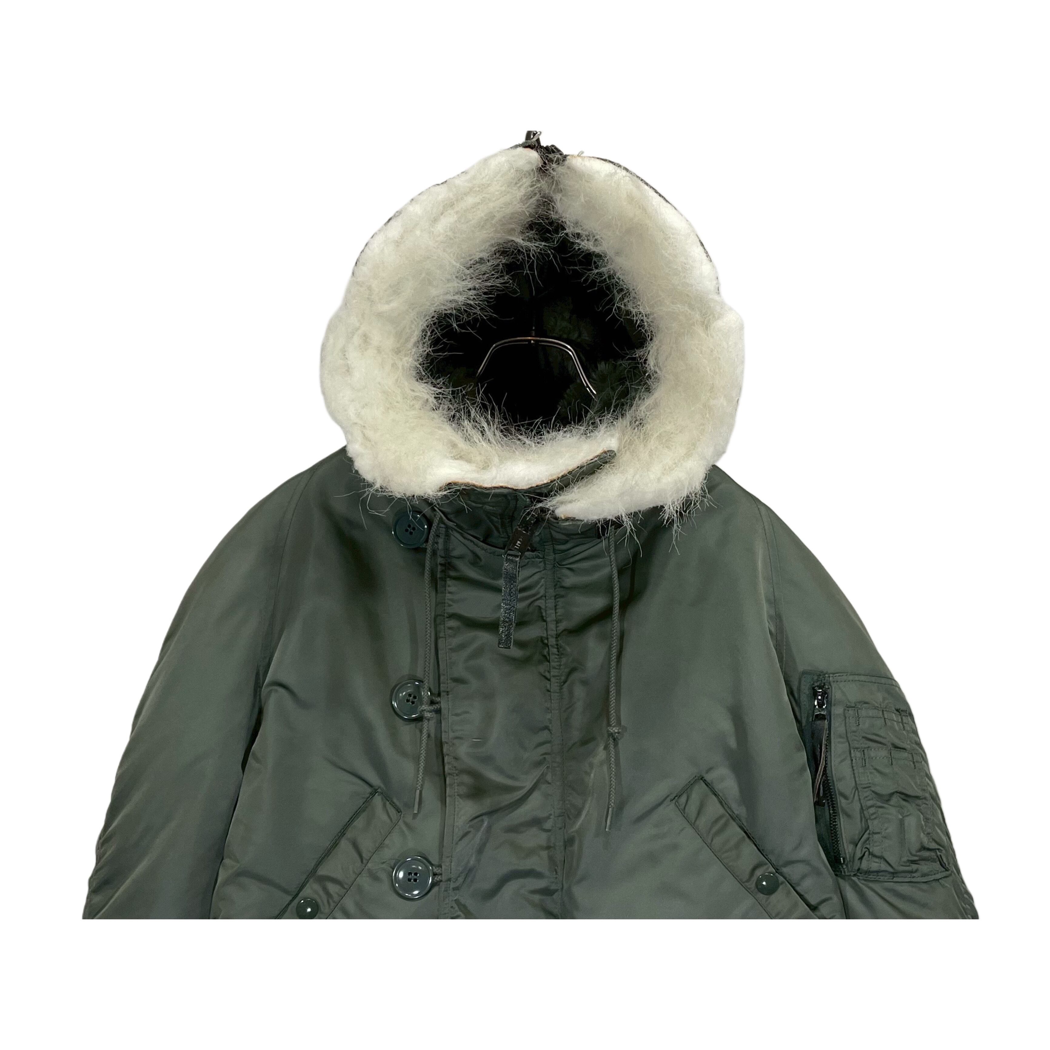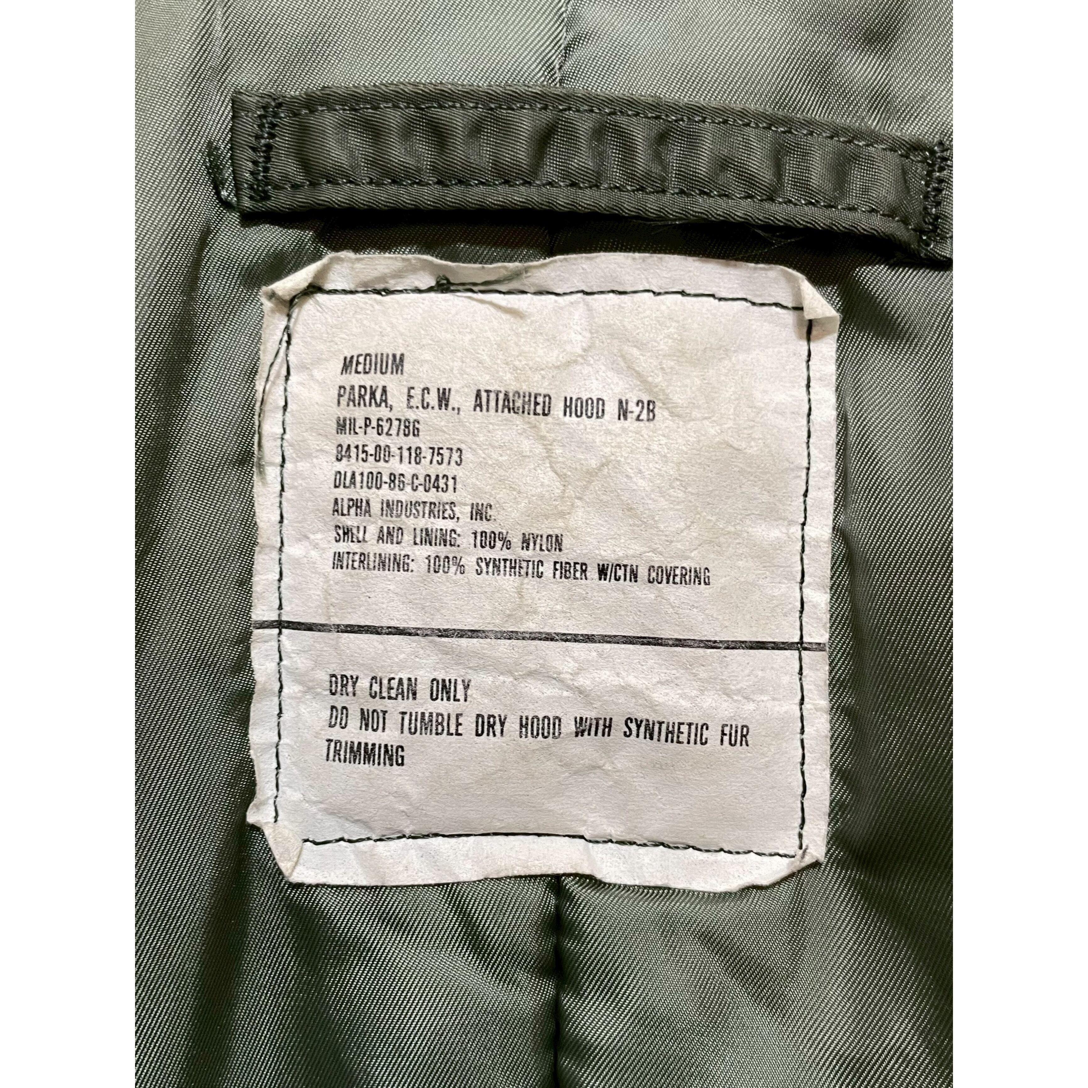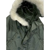 80s USAF "PARKA, E.C.W., ATTACHED HOOD N-2B" olive nylon thintetic fiber quilted lining short length