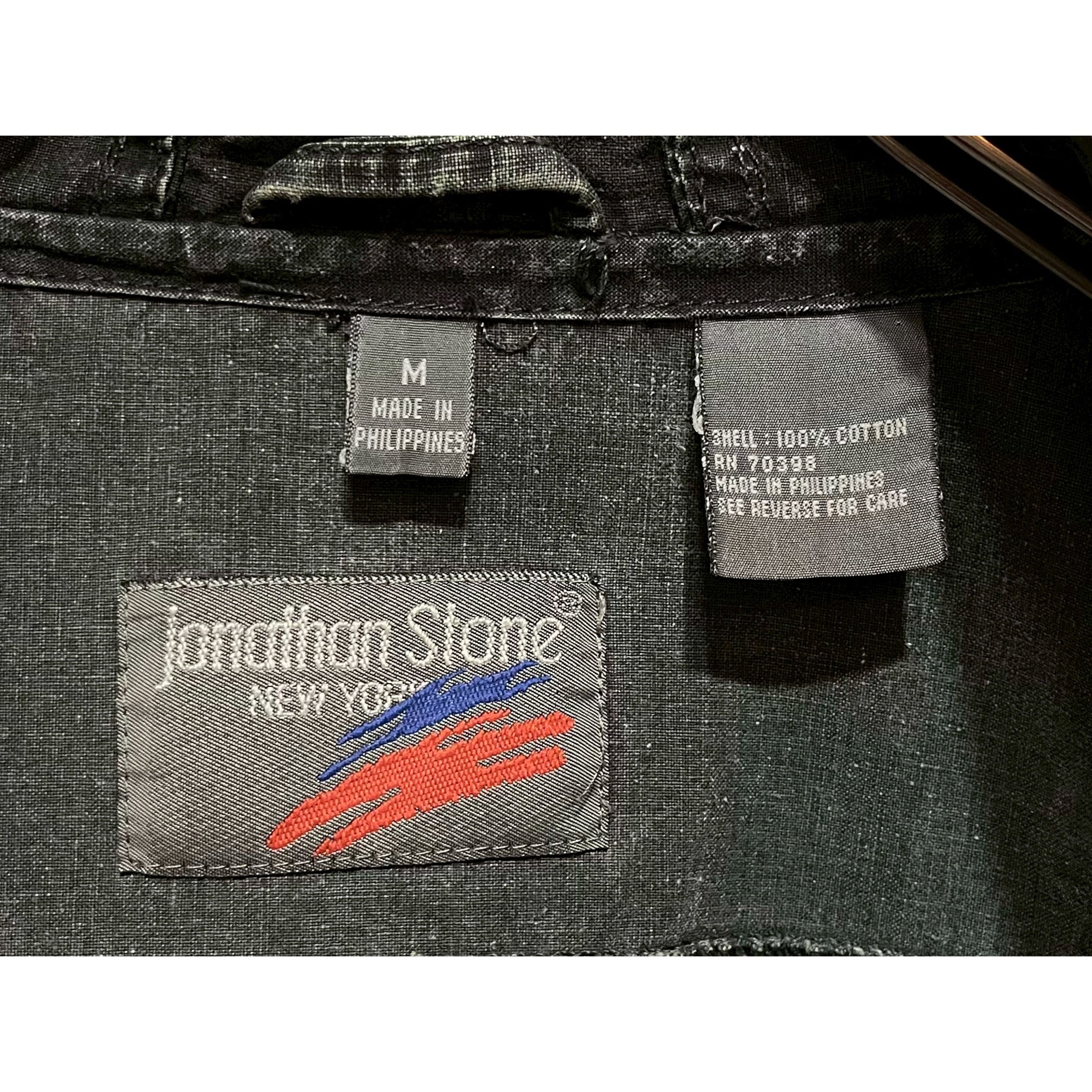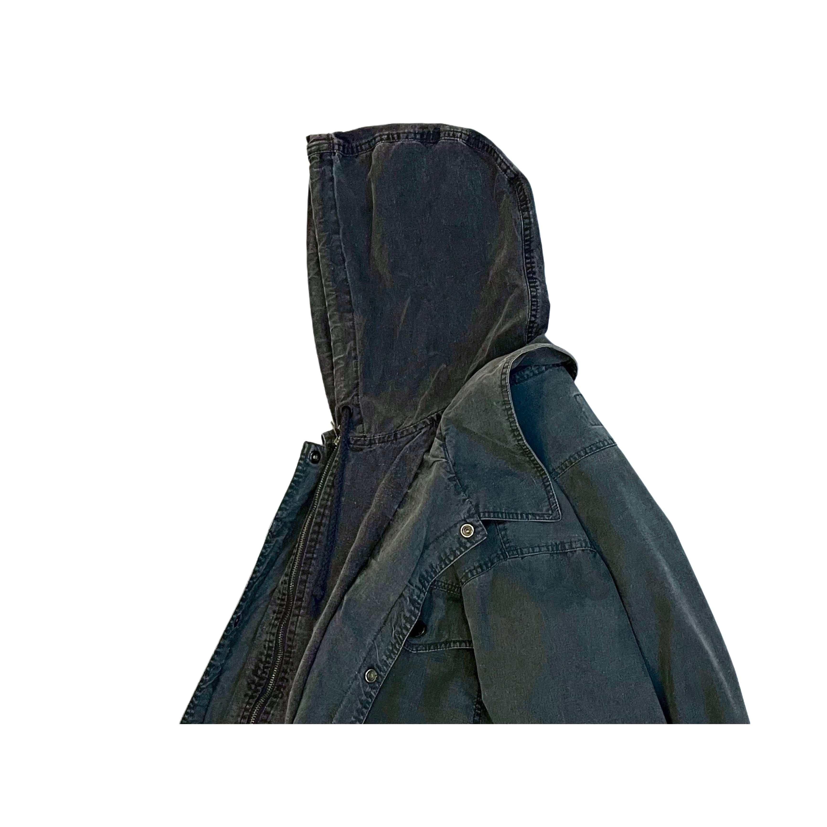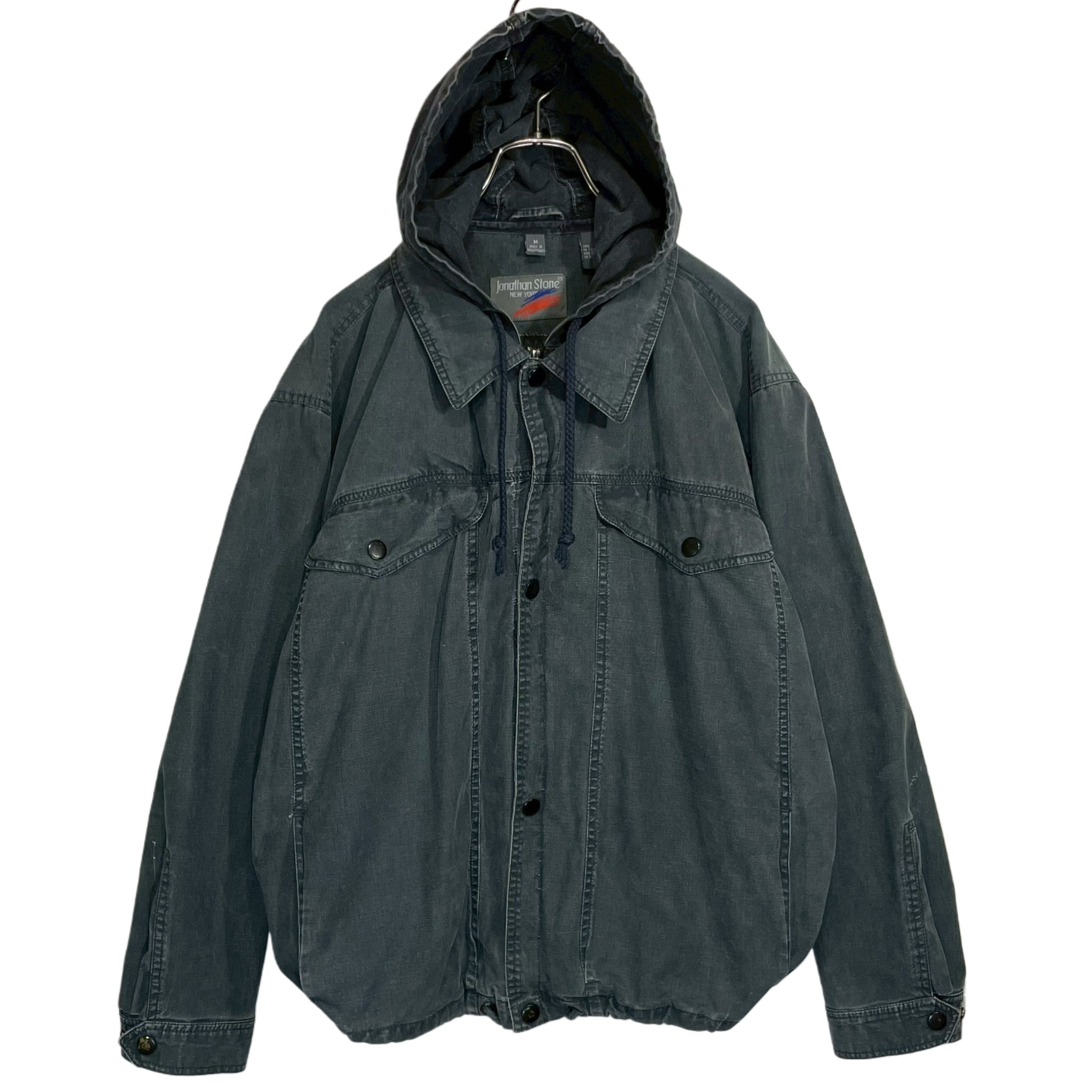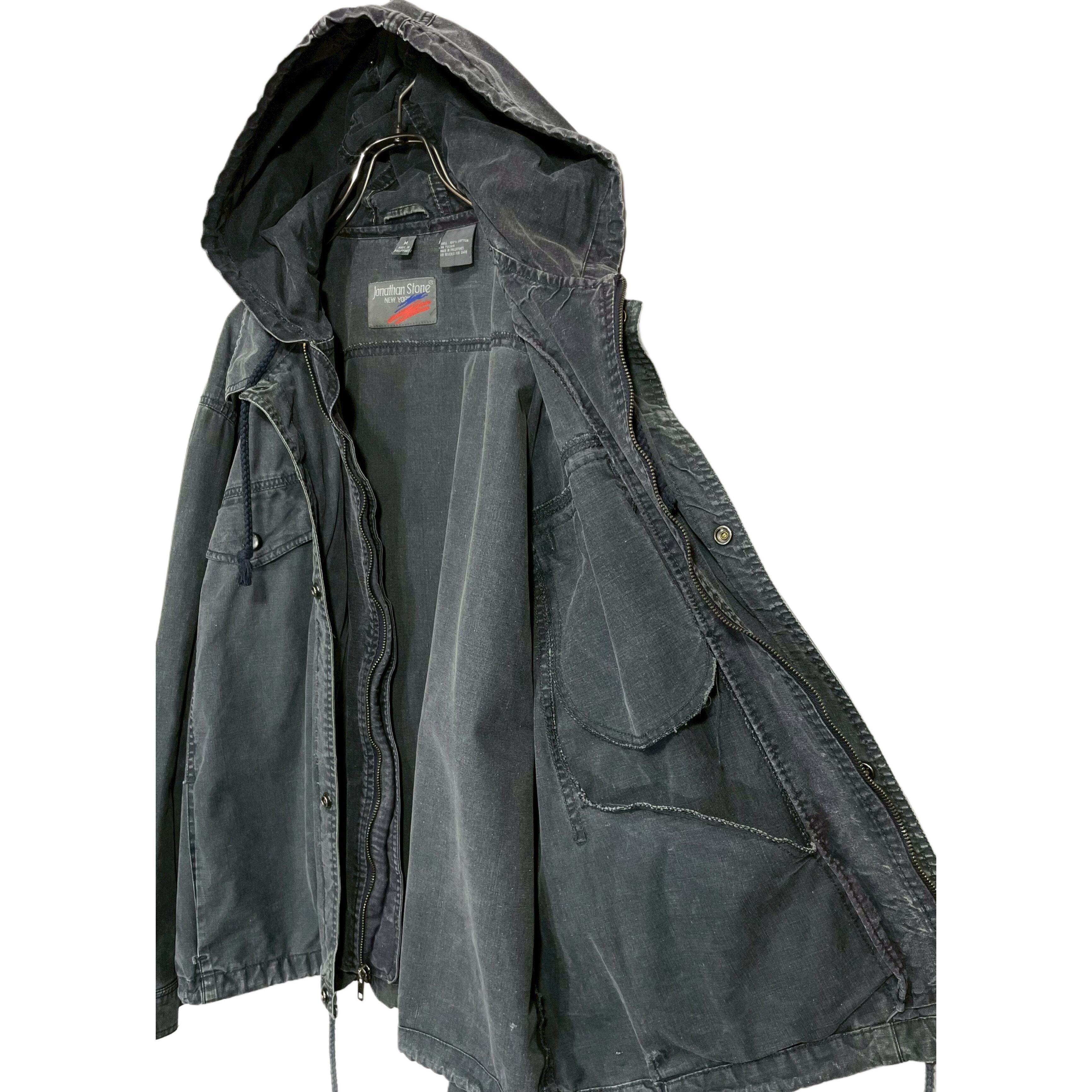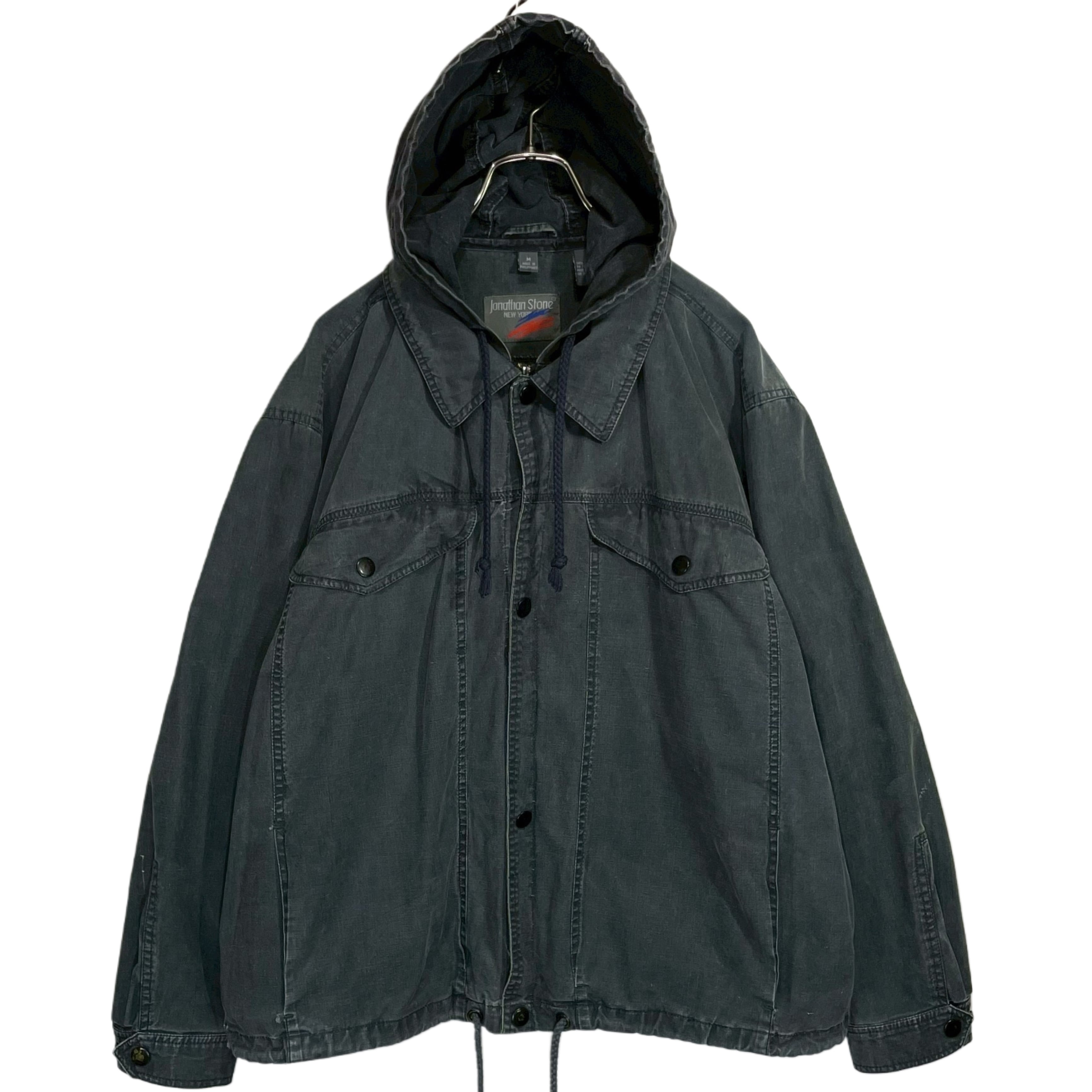 80s Jonathan Stone faded black cotton layered design short length box silhouette zip up and snap botton hoodedjacket