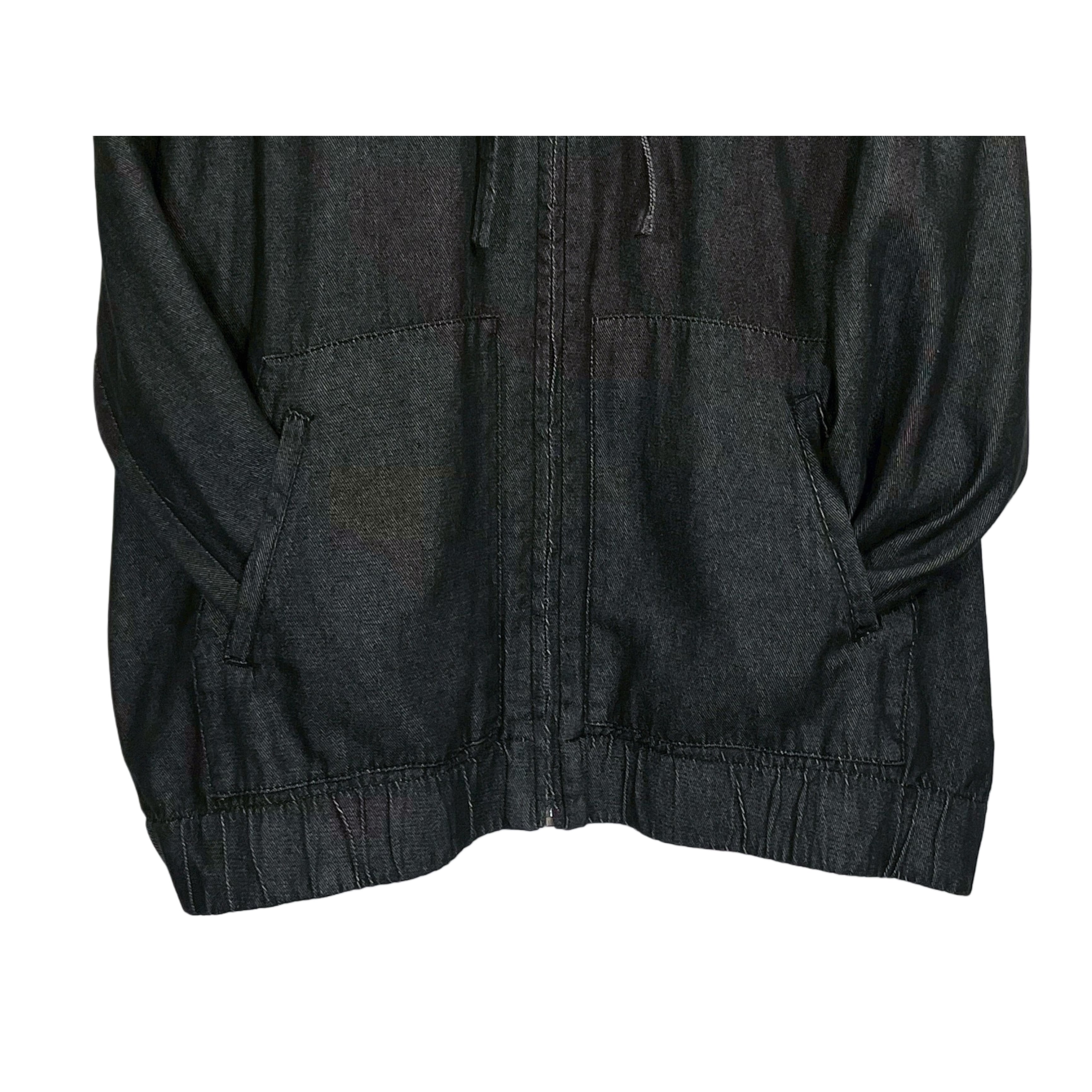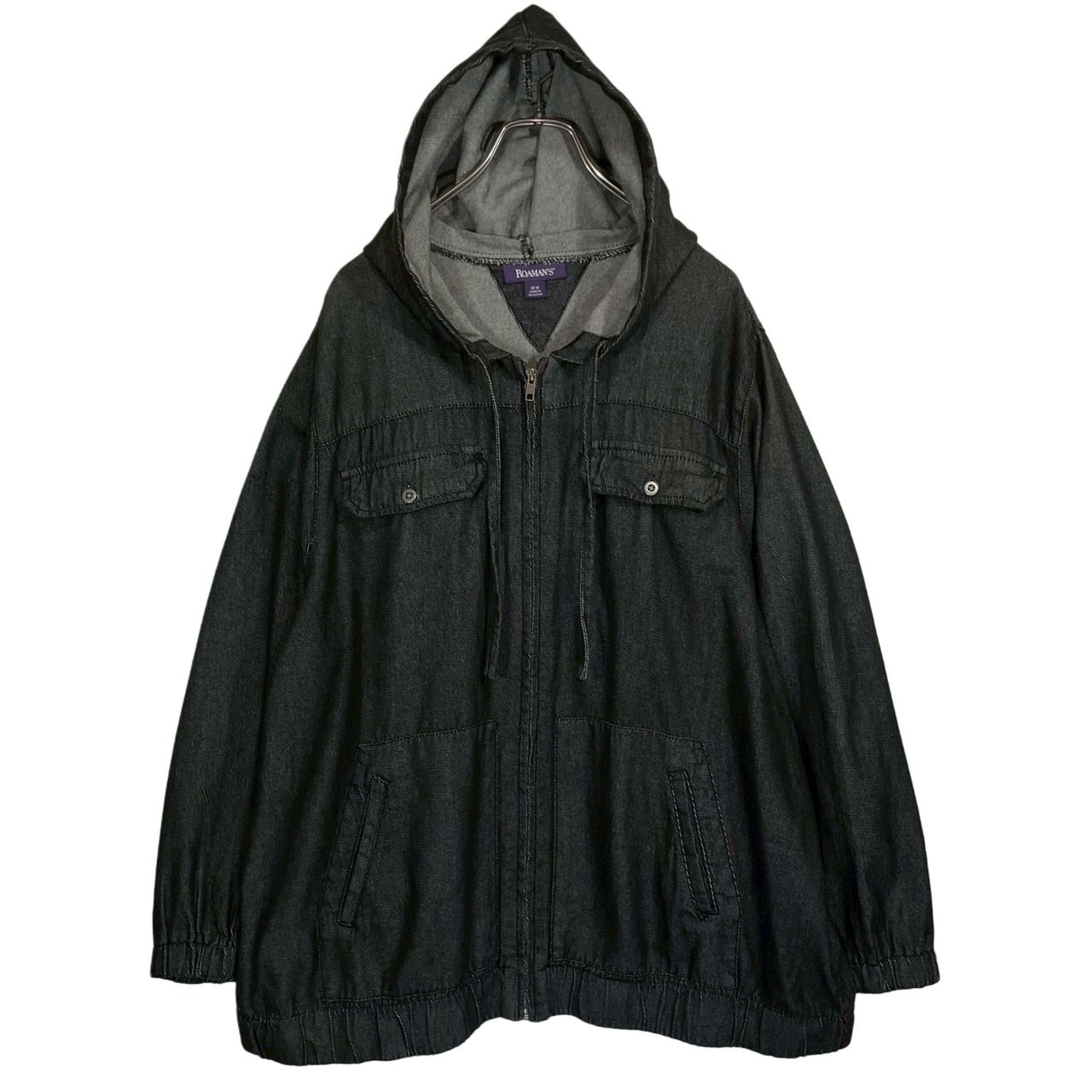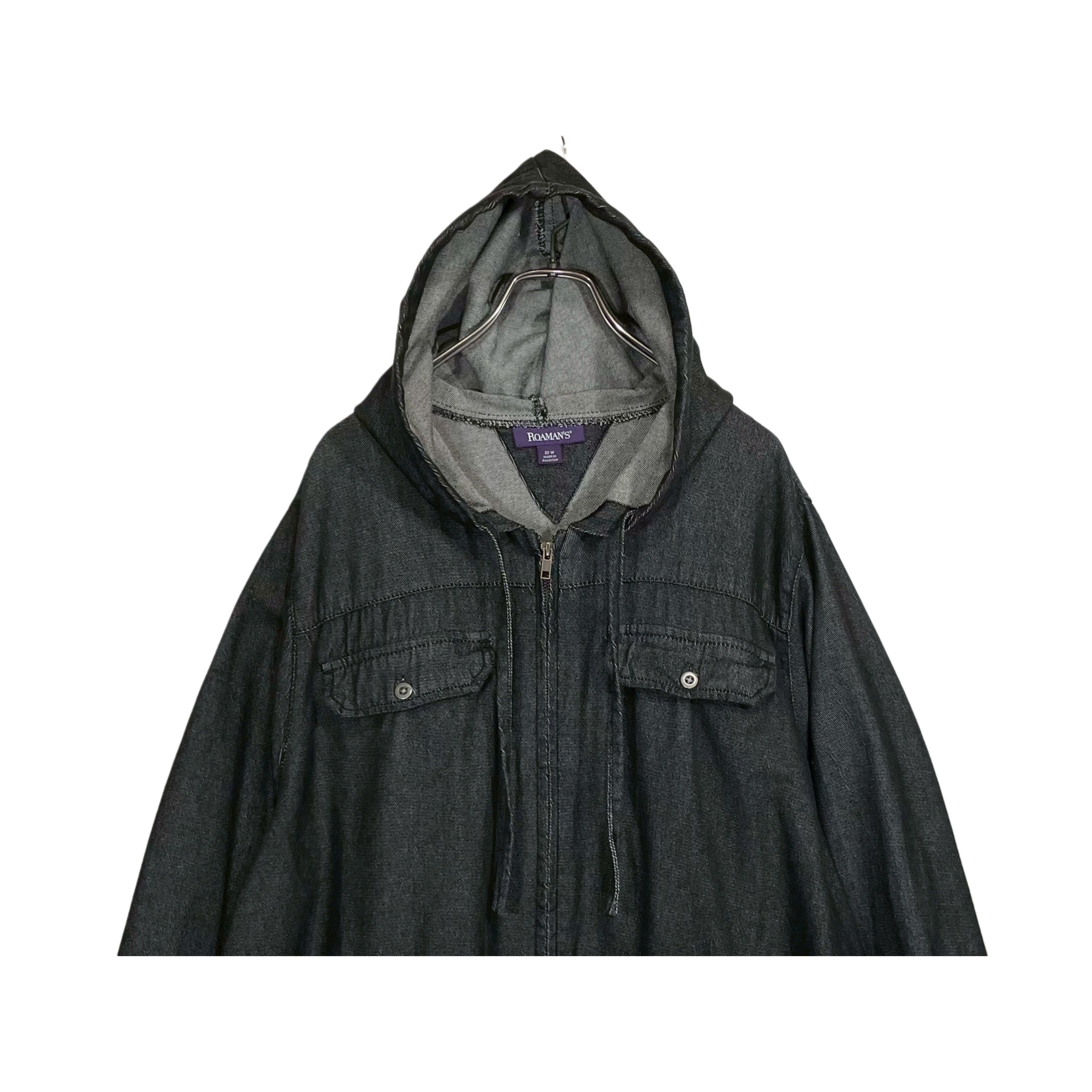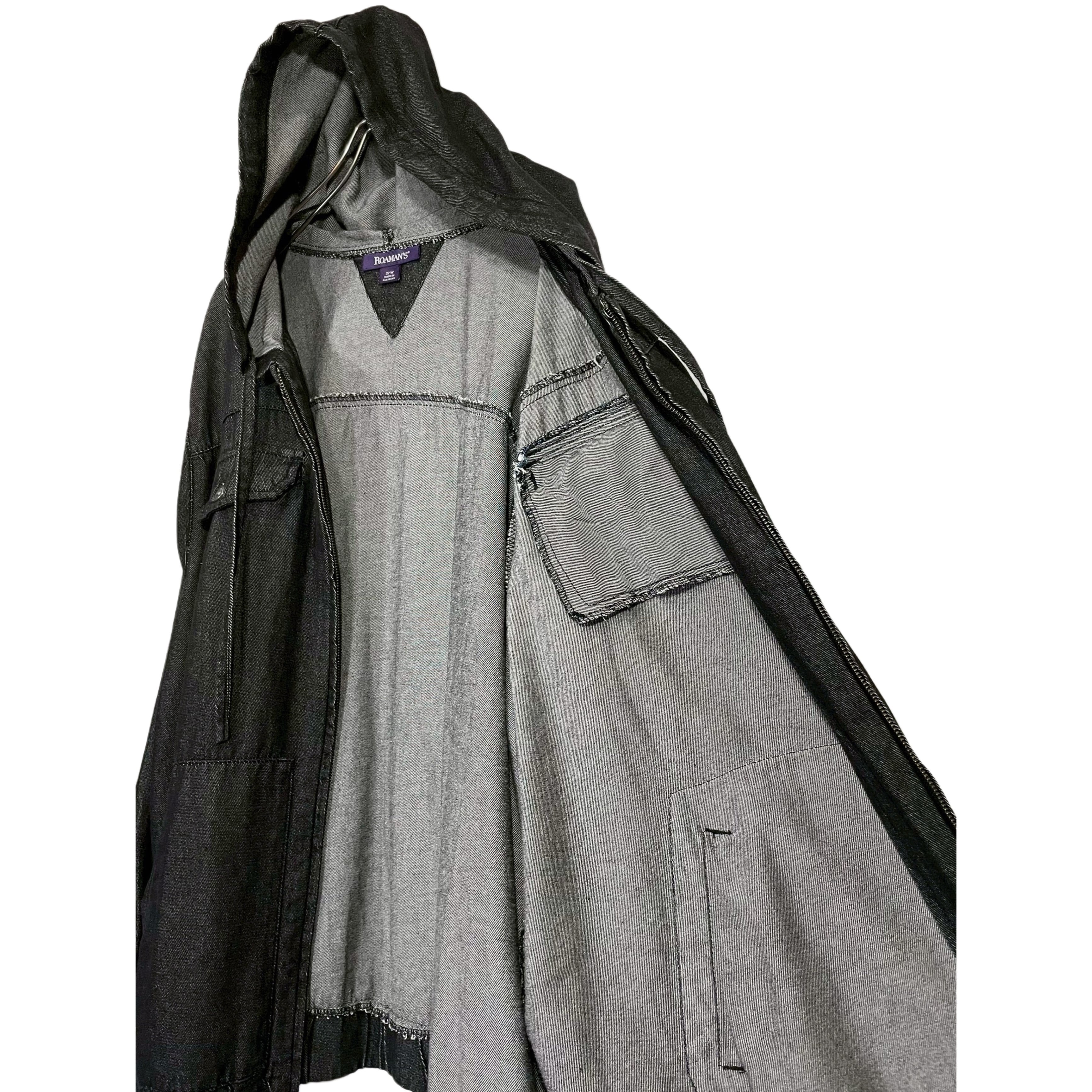 ROAMAN'S black cotton yern dyed light oz denim zip up oversized hooded jacket