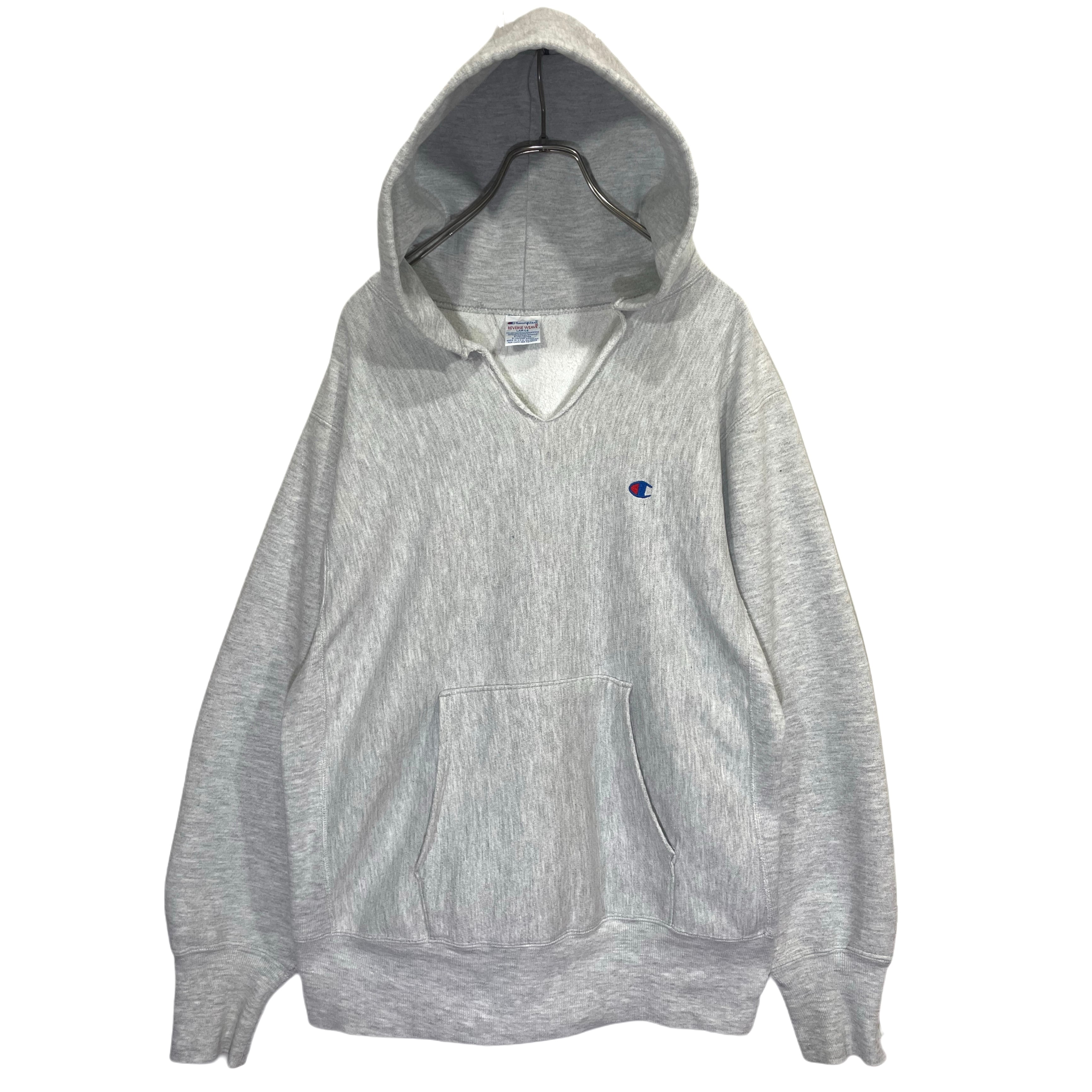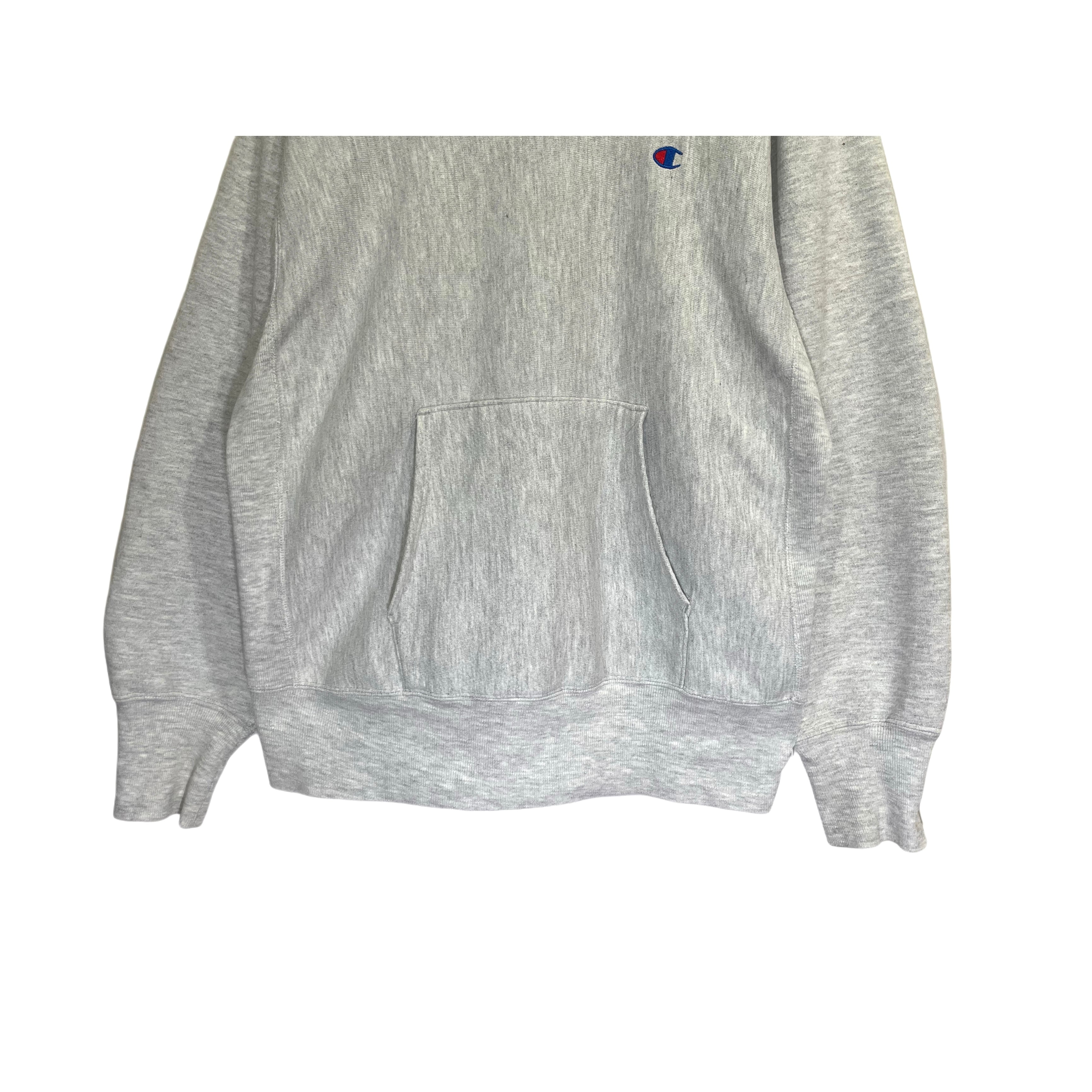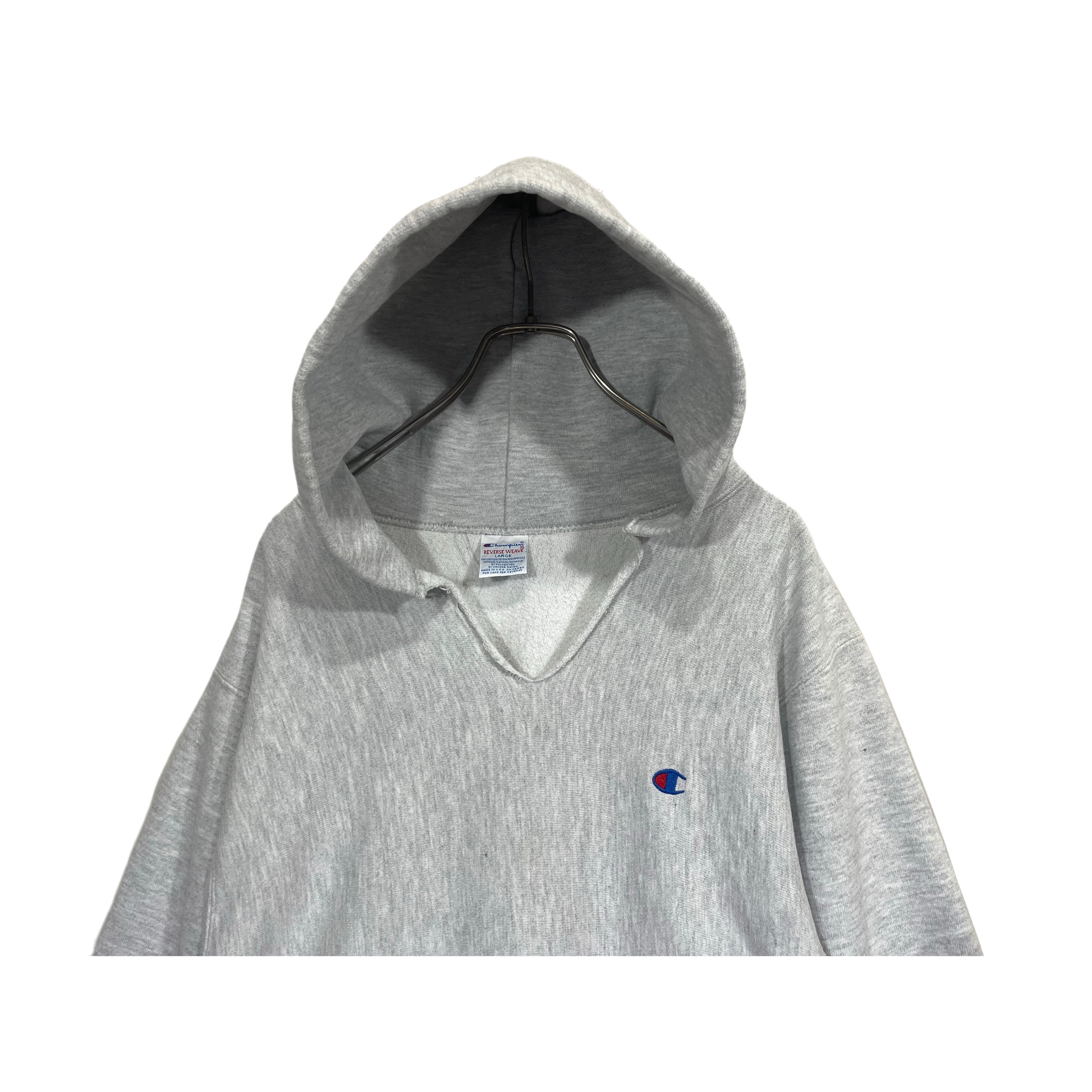 90s champion reverse weave heather grey cottonxpolyesterxrayon ripped neckline hooded pullover sweat parka