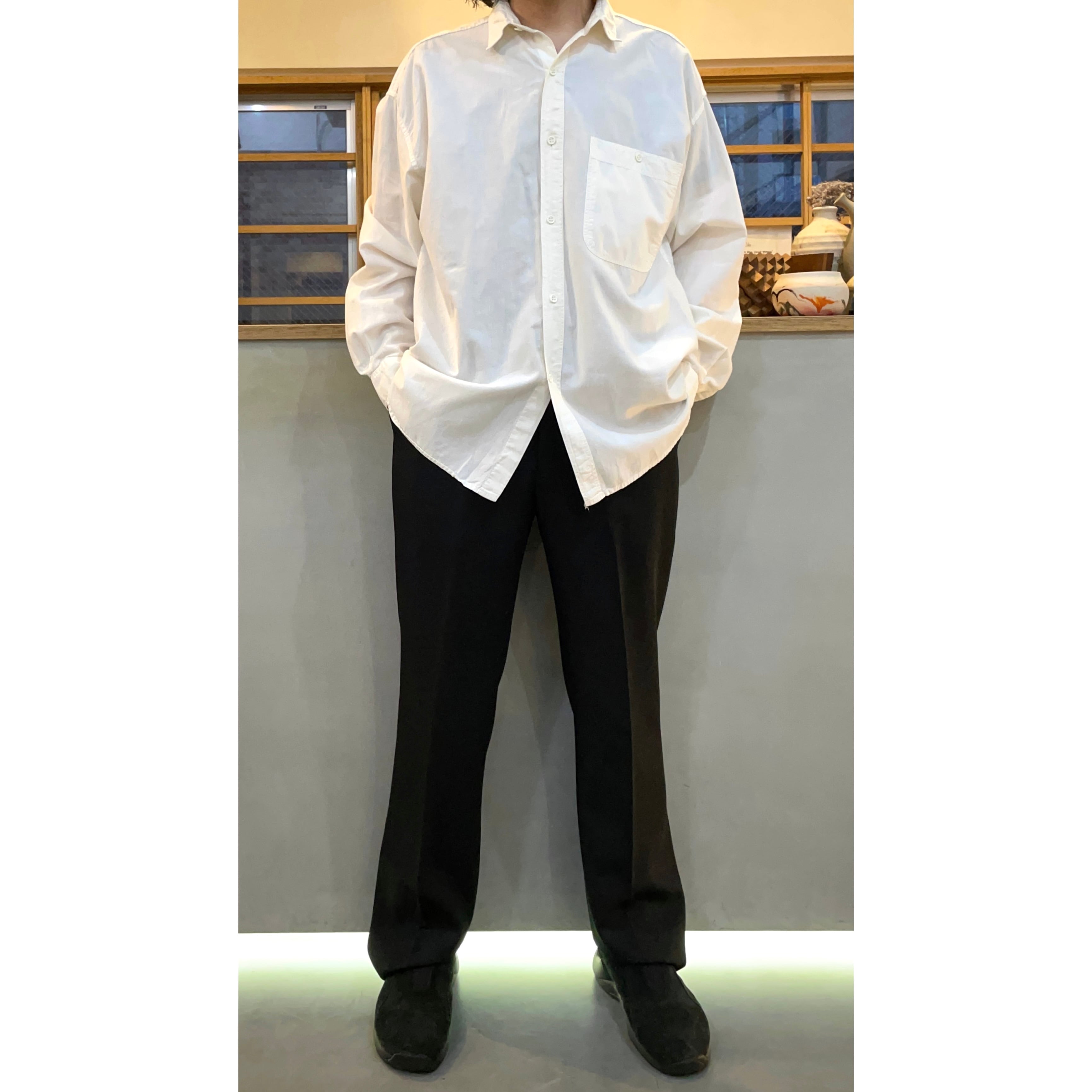 身幅たっぷりワイドで、袖も太めでカフスでまとまるシルエット
