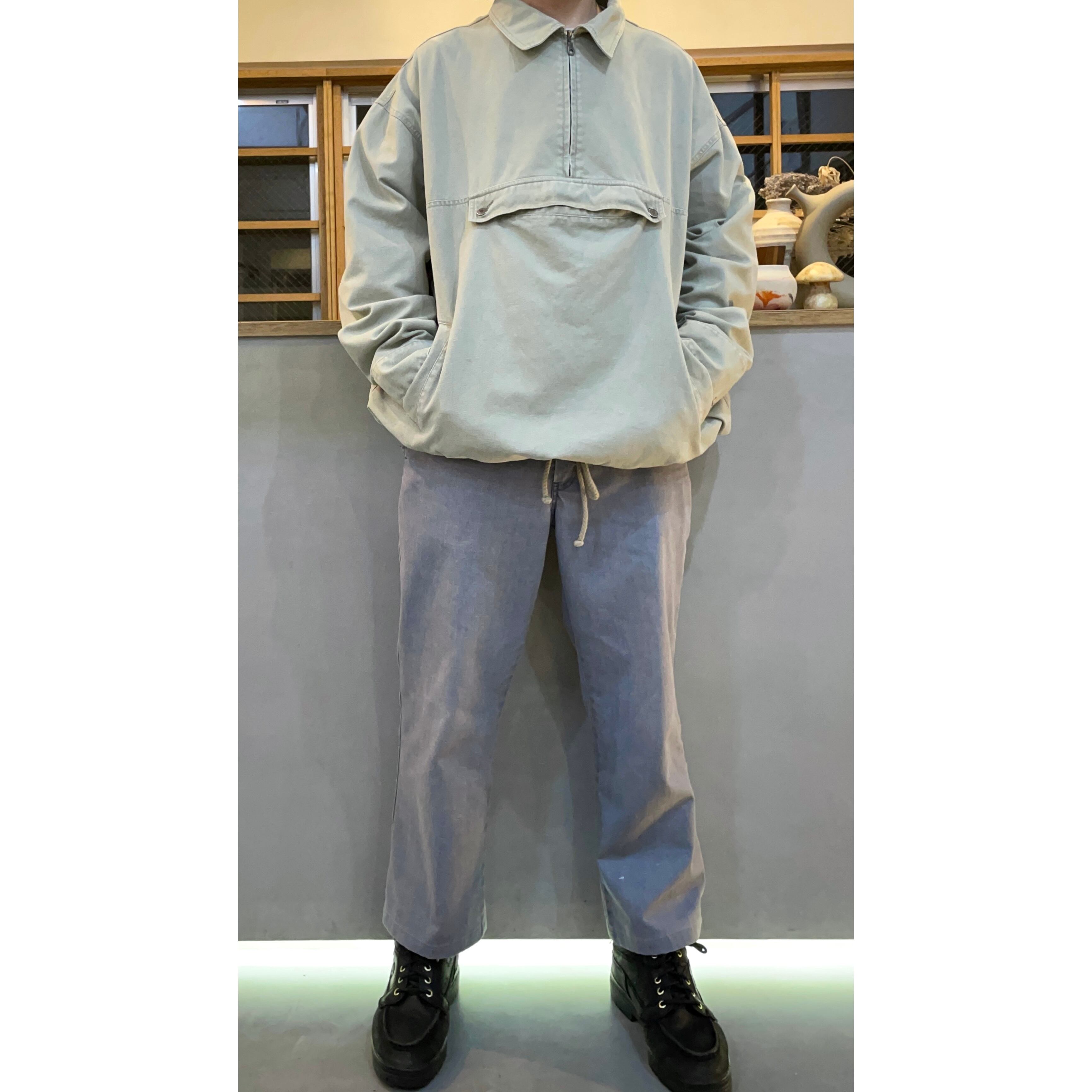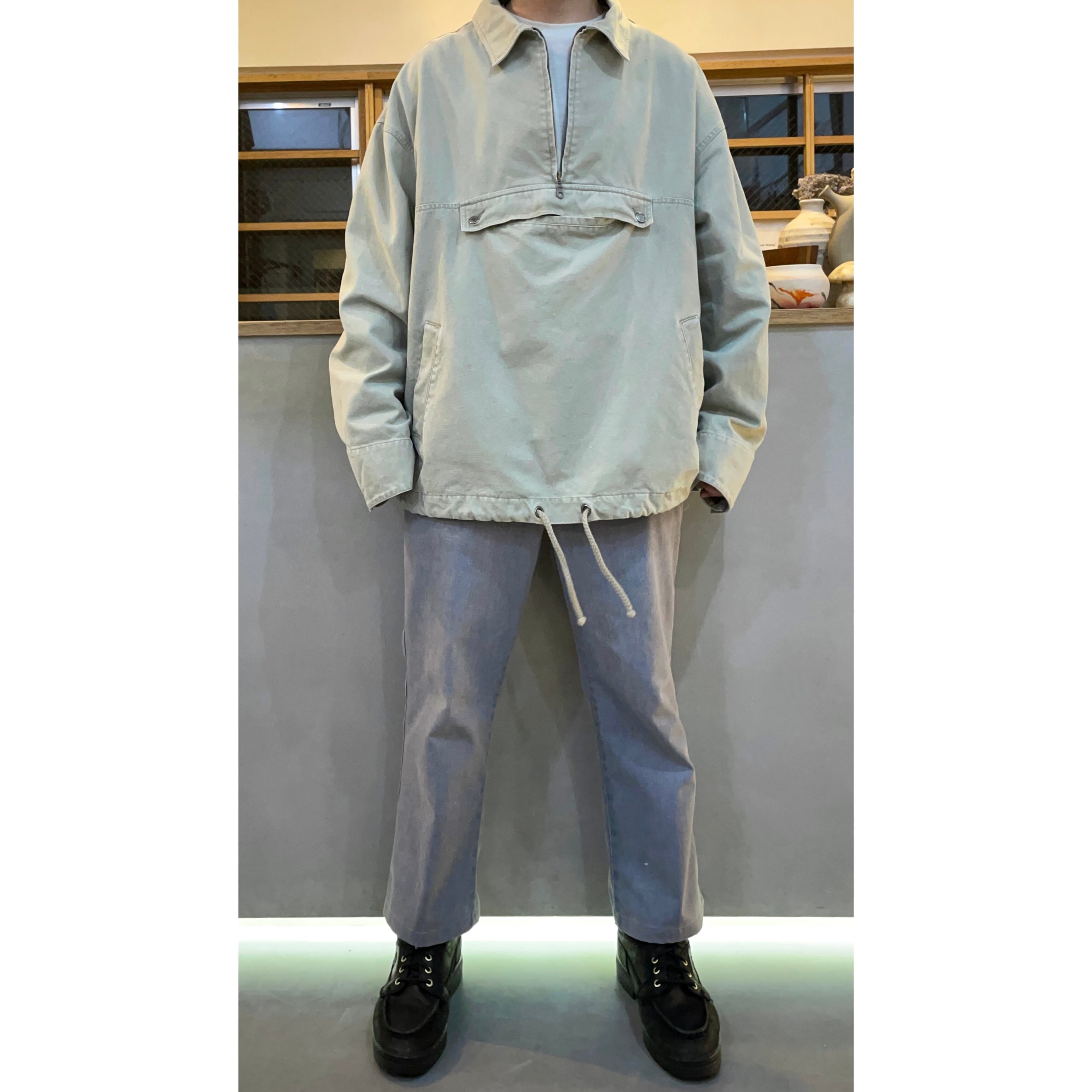 ハーフジップ仕様でフロントフラップポケットのアノラック的ディテールでフードではなく襟