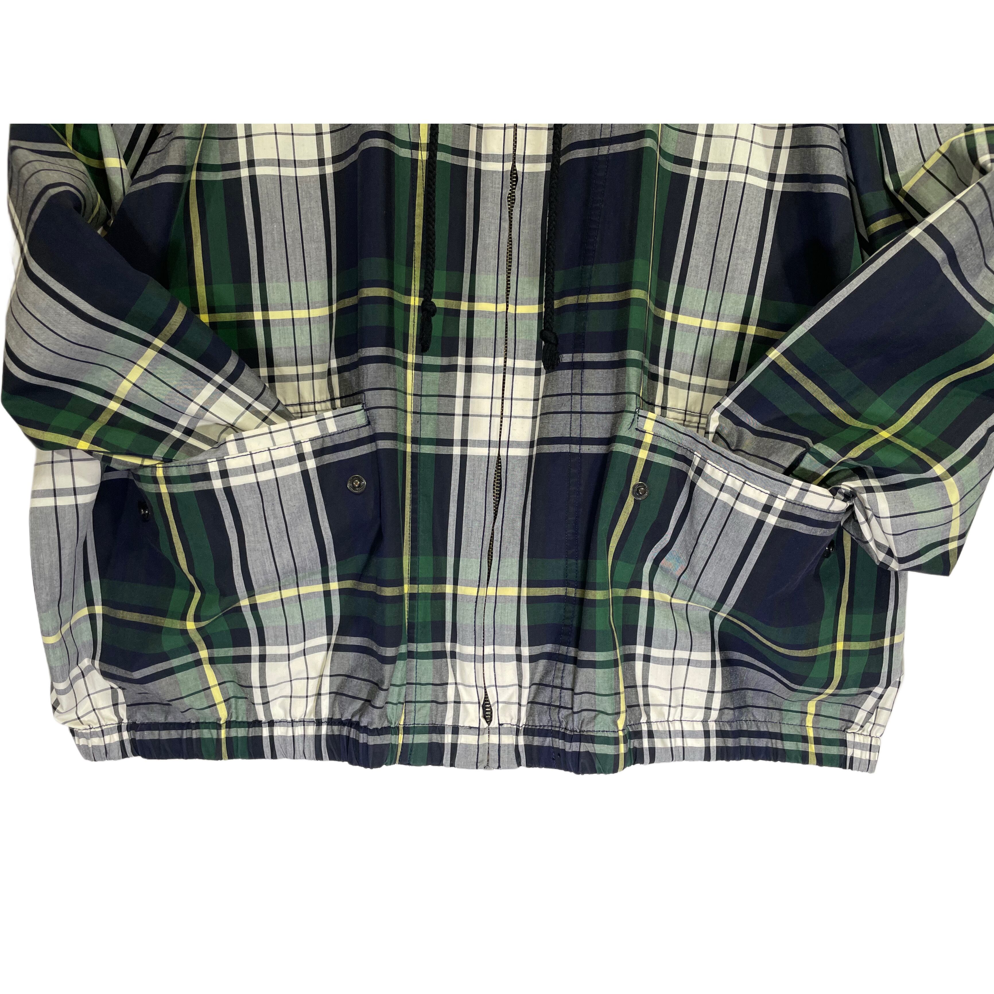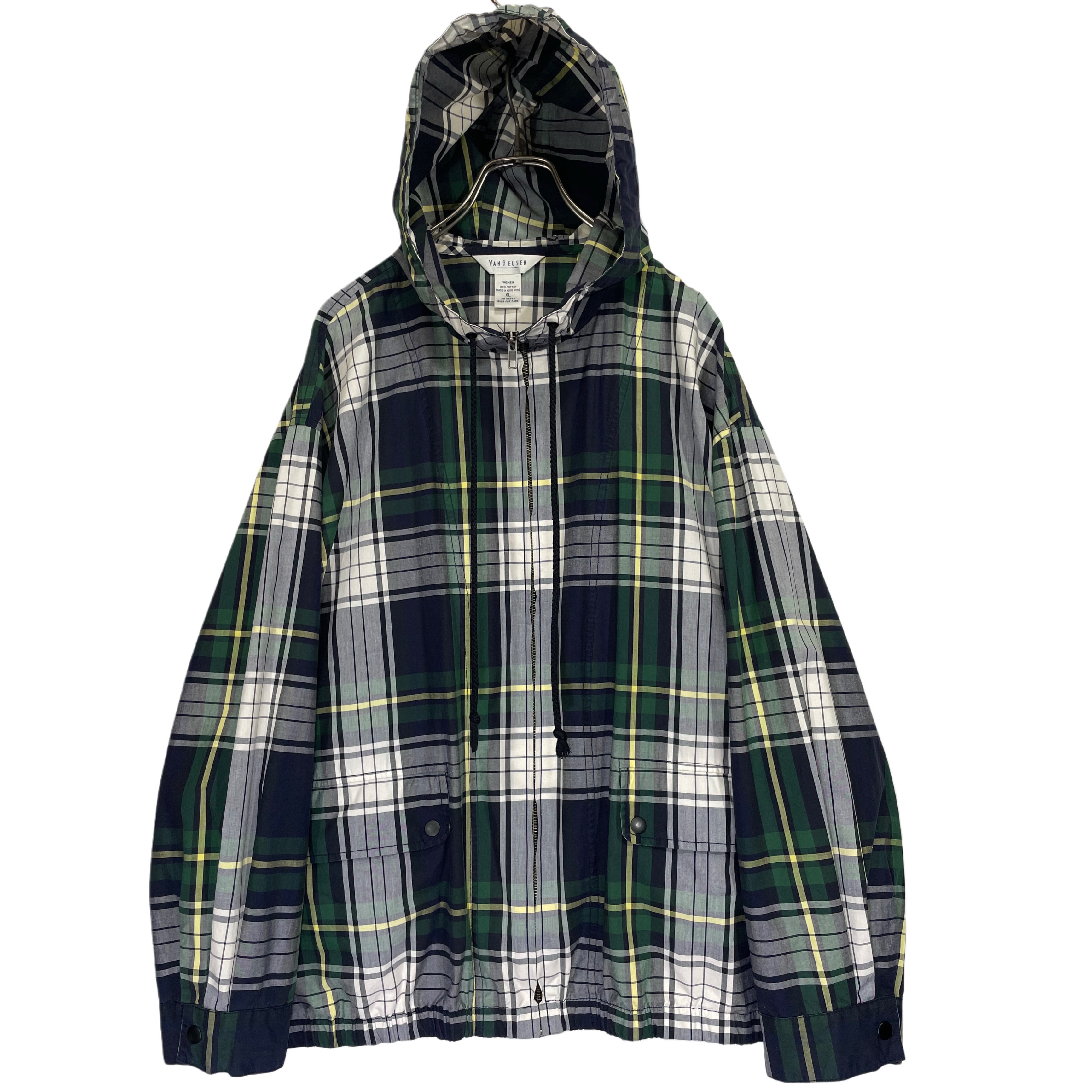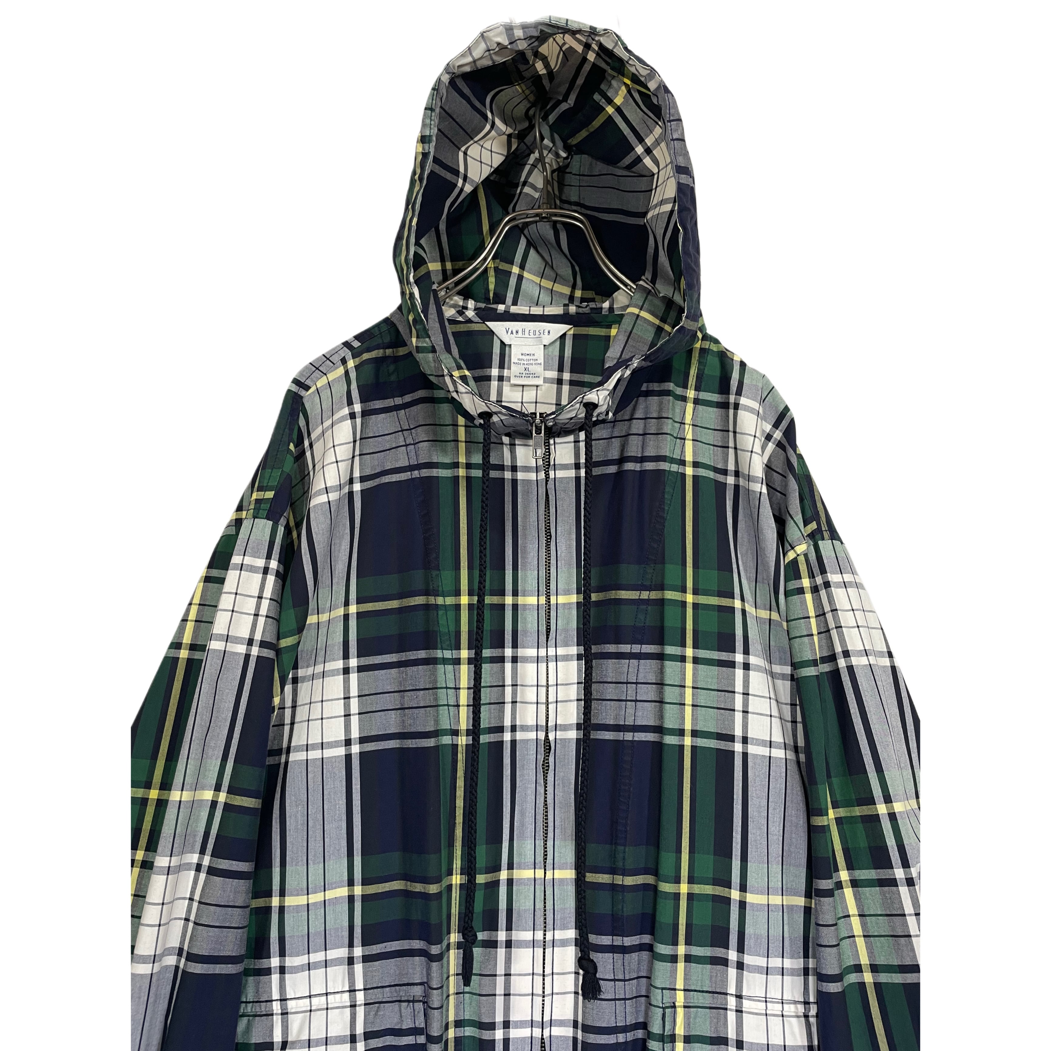 -90s VAN HAUSEN green/white/yellow plaid cotton poplin zip up hooded jacket